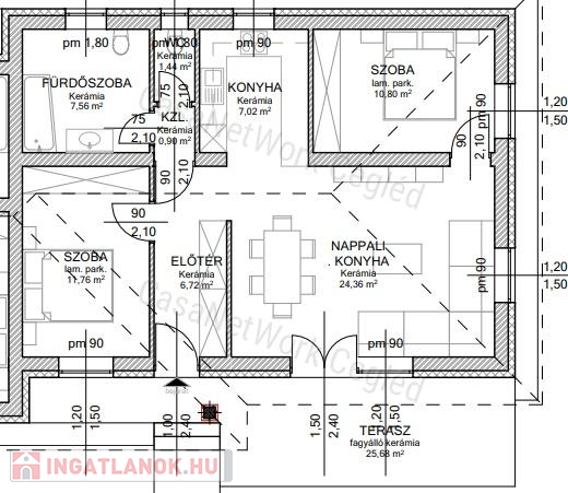 A hirdetett lakás: A. lakás: fűtött lakótér: 70,56 nm + 25,68 nm terasz